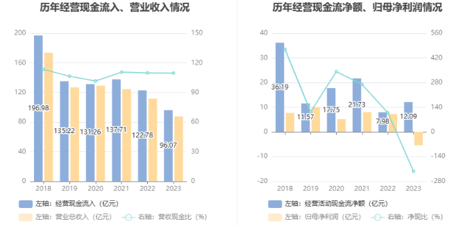 2023年,公司经营活动现金流净额为12.09亿元,同比增长51.59%;筹资活动现金流净额-12.43亿元,同比增加11.95亿元;投资活动现金流净额1.45亿元,上年同期为-4.88亿元。