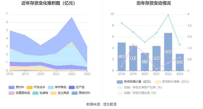 从存货变动来看,截至2023年年末,公司存货账面价值为3.01亿元,占净资产的1.83%,较上年末减少3.68亿元。其中,存货跌价准备为286.77万元,计提比例为0.94%。