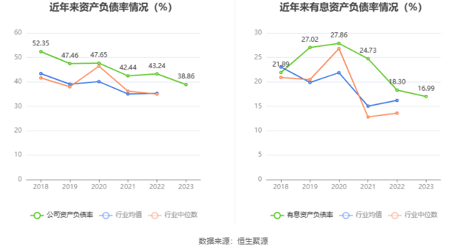 在偿债能力方面,公司2023年年末资产负债率为38.86%,相比上年末下降4.38个百分点;有息资产负债率为16.99%,相比上年末下降1.31个百分点。