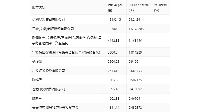 年报显示,2023年年末公司十大流通股东中,持股最多的为亿利资源集团有限公司,占比34.24%。十大流通股东名单相比2023年三季报维持不变。在具体持股比例上,杨竣凯、广发证券股份有限公司持股有所上升,亿利资源集团有限公司、香港中央结算有限公司持股有所下降。