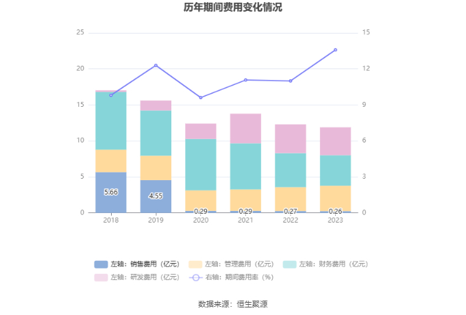 2023年,公司期间费用为11.89亿元,同比减少4057.15万元;但期间费用率为13.58%,同比增长2.58个百分点。其中,销售费用同比下降4.37%,管理费用同比增长6.14%,研发费用同比下降2.97%,财务费用同比下降10.14%。