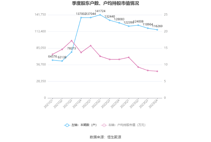 筹码集中度方面,截至2023年年末,公司股东总户数为11.63万户,较三季度末下降了2695户,降幅2.27%;户均持股市值由三季度末的8.29万元下降至8.05万元,降幅为2.90%。