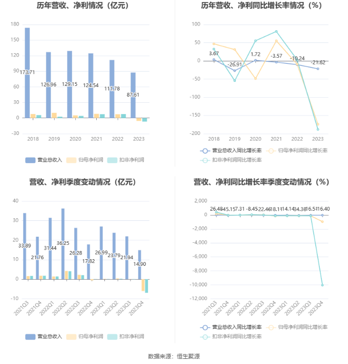 2023年,公司毛利率为6.78%,同比下降7.53个百分点;净利率为-6.80%,较上年同期下降15.13个百分点。从单季度指标来看,2023年第四季度公司毛利率为1.23%,同比下降15.83个百分点,环比下降6.08个百分点;净利率为-40.68%,较上年同期下降37.44个百分点,较上一季度下降38.67个百分点。