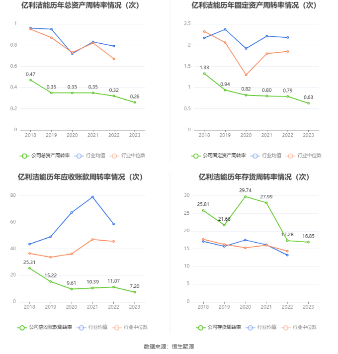 营运能力方面,2023年,公司公司总资产周转率为0.26次,上年同期为0.32次(2022年行业平均值为0.79次,公司位居同行业15/16);固定资产周转率为0.63次,上年同期为0.79次(2022年行业平均值为2.18次,公司位居同行业14/16);公司应收账款周转率、存货周转率分别为7.20次、16.85次。
