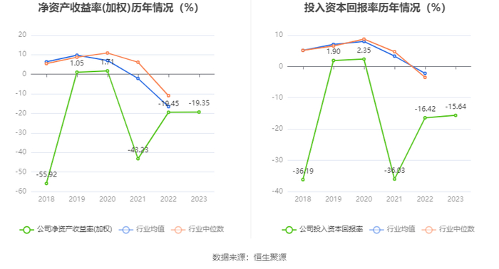 数据显示,2023年公司加权平均净资产收益率为-19.35%,较上年同期增长0.10个百分点;公司2023年投入资本回报率为-15.64%,较上年同期增长0.78个百分点。