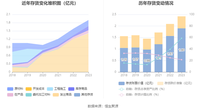 从存货变动来看,截至2023年年末,公司存货账面价值为1.9亿元,占净资产的58.84%,较上年末增加3252.65万元。其中,存货跌价准备为5238.66万元,计提比例为21.62%。