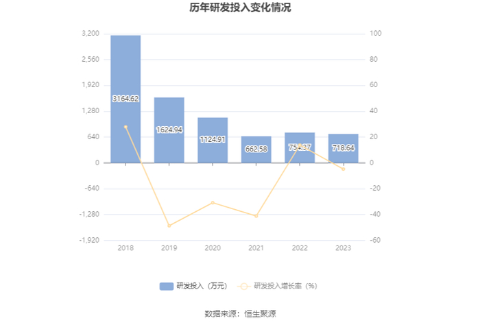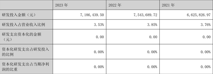 2023年全年,公司研发投入金额为718.64万元,同比下降4.74%;研发投入占营业收入比例为3.53%,相比上年同期下降0.32个百分点。此外,公司全年研发投入资本化率为0。