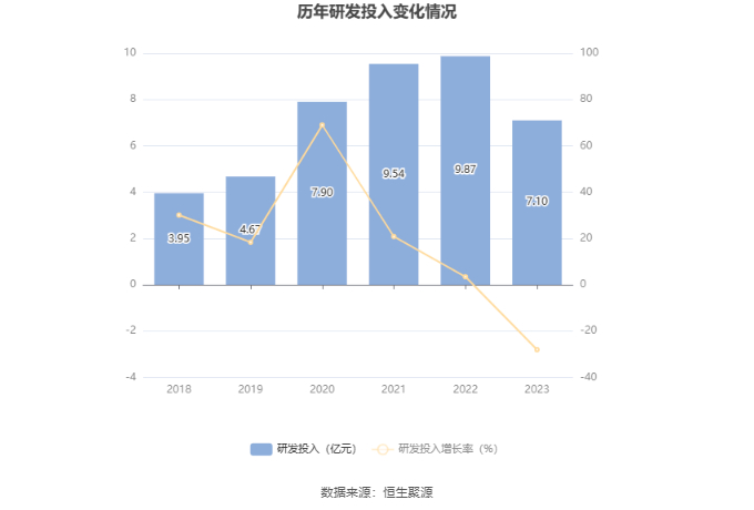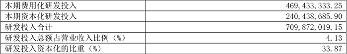 2023年全年,公司研发投入金额为7.10亿元,同比下降28.05%;研发投入占营业收入比例为4.13%,相比上年同期持平。此外,公司全年研发投入资本化率为33.87%。