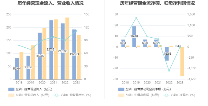 2023年,公司经营活动现金流净额为1.43亿元,同比增加14.06亿元;筹资活动现金流净额13.25亿元,同比增加2.15亿元;投资活动现金流净额-9.01亿元,上年同期为-1.99亿元。