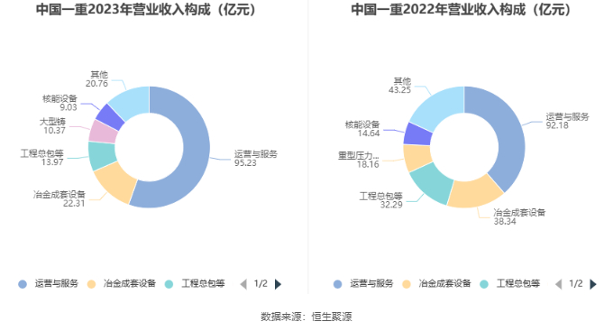 分产品来看,2023年公司主营业务中,运营与服务收入95.23亿元,同比增长3.31%,占营业收入的55.47%;冶金成套设备收入22.31亿元,同比下降41.82%,占营业收入的12.99%;工程总包等收入13.97亿元,同比下降56.74%,占营业收入的8.14%。