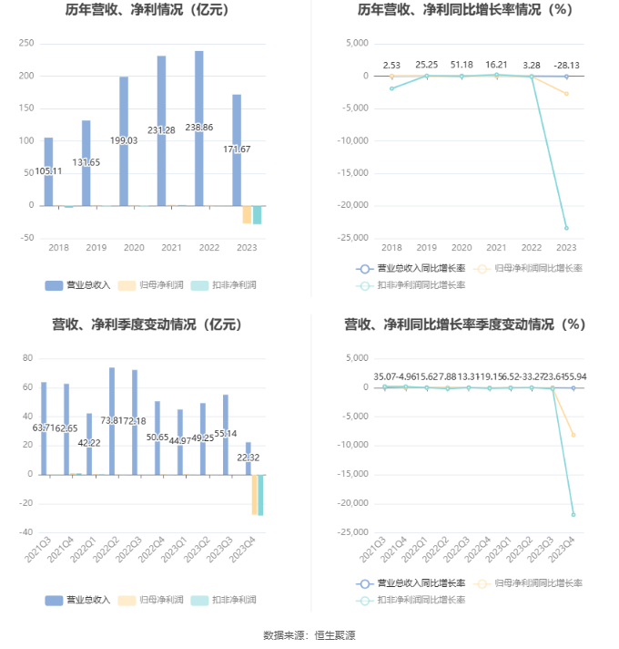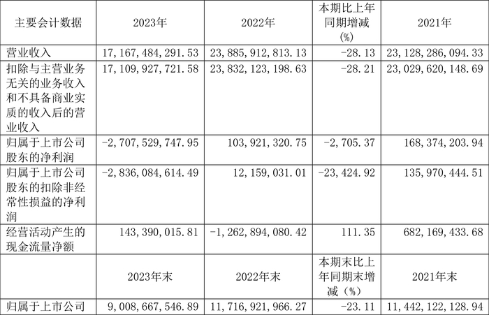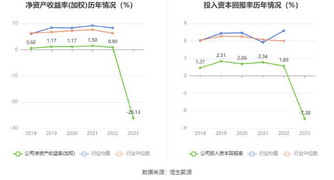 数据显示,2023年公司加权平均净资产收益率为-26.13%,较上年同期下降27.03个百分点;公司2023年投入资本回报率为-7.38%,较上年同期下降9.07个百分点。