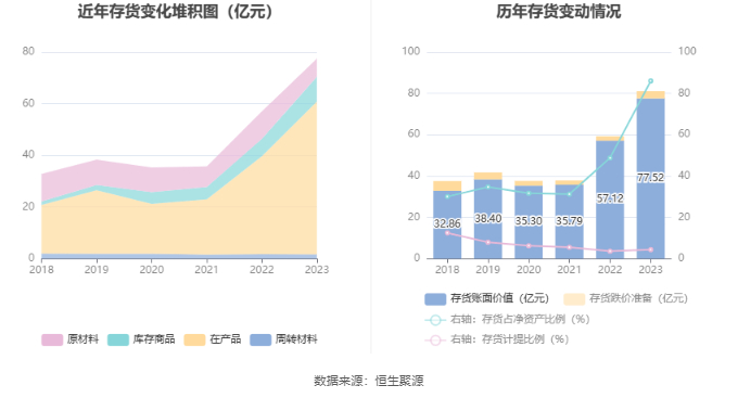 从存货变动来看,截至2023年年末,公司存货账面价值为77.52亿元,占净资产的86.05%,较上年末增加20.4亿元。其中,存货跌价准备为3.56亿元,计提比例为4.39%。