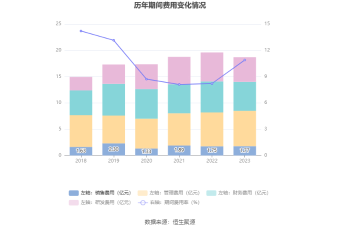 2023年,公司期间费用为18.69亿元,较上年同期减少9182.26万元;但期间费用率为10.89%,较上年同期上升2.68个百分点。其中,销售费用同比增长0.84%,管理费用同比增长4.2%,研发费用同比下降14.95%,财务费用同比下降6.43%。