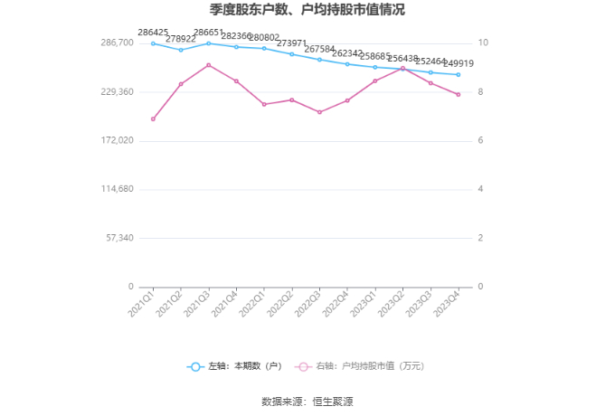 筹码集中度方面,截至2023年年末,公司股东总户数为24.99万户,较三季度末下降了2545户,降幅1.01%;户均持股市值由三季度末的8.37万元下降至7.90万元,降幅为5.62%。