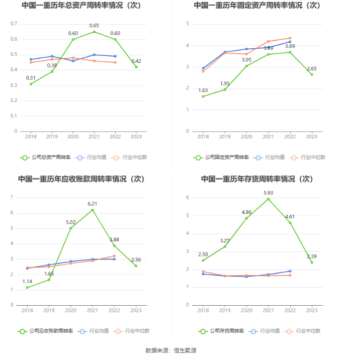 营运能力方面,2023年,公司公司总资产周转率为0.42次,上年同期为0.60次(2022年行业平均值为0.49次,公司位居同行业13/49);固定资产周转率为2.65次,上年同期为3.69次(2022年行业平均值为4.18次,公司位居同行业27/49);公司应收账款周转率、存货周转率分别为2.56次、2.39次。