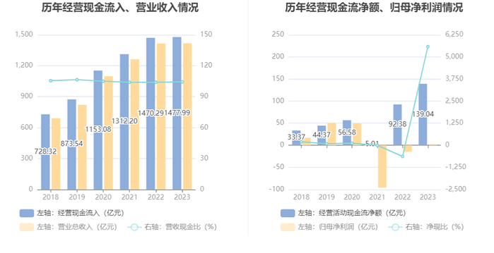 2023年,公司经营活动现金流净额为139.04亿元,同比增长50.50%;筹资活动现金流净额-149.32亿元,同比减少94.44亿元;投资活动现金流净额550.26万元,上年同期为-82.34亿元。