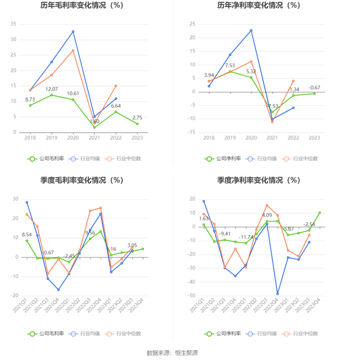 2023年,公司毛利率为2.75%,同比下降3.89个百分点;净利率为-0.67%,较上年同期上升0.67个百分点。从单季度指标来看,2023年第四季度公司毛利率为4.31%,同比下降9.04个百分点,环比上升1.26个百分点;净利率为10.25%,较上年同期上升6.09个百分点,较上一季度上升12.79个百分点。