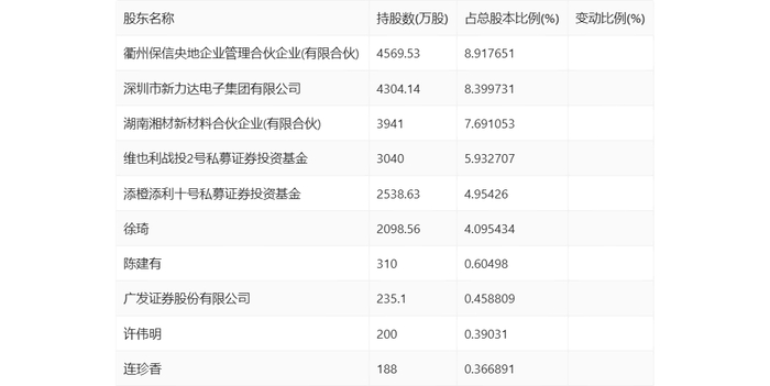 年报显示,2023年年末公司十大流通股东中,新进股东为陈建有、广发证券股份有限公司、连珍香,取代了三季度末的珠海格力股权投资基金管理有限公司-珠海格金六号股权投资基金合伙企业(有限合伙)、刘洋、程浩生。在具体持股比例上,衢州保信央地企业管理合伙企业(有限合伙)、深圳市新力达电子集团有限公司、湖南湘材新材料合伙企业(有限合伙)、维也利战投2号私募证券投资基金、添橙添利十号私募证券投资基金、徐琦、许伟明持股有所下降。