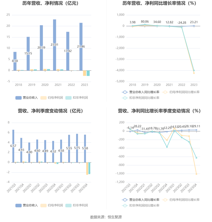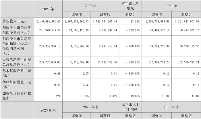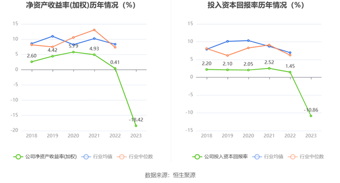 数据显示,2023年公司加权平均净资产收益率为-18.42%,较上年同期下降18.83个百分点;公司2023年投入资本回报率为-10.86%,较上年同期下降12.31个百分点。