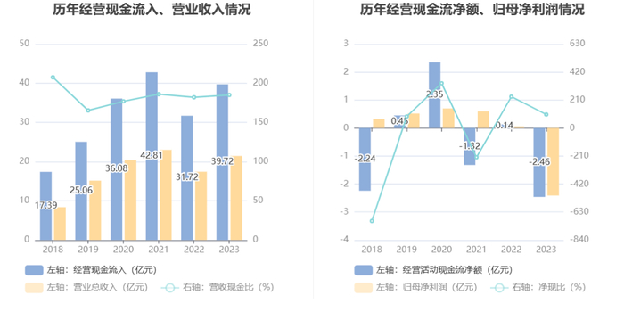 2023年,公司经营活动现金流净额为-2.46亿元,同比减少2.60亿元;筹资活动现金流净额1.21亿元,同比增加1.42亿元;投资活动现金流净额-2.80亿元,上年同期为-3.32亿元。