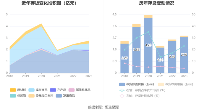 从存货变动来看,截至2023年年末,公司存货账面价值为2.76亿元,占净资产的23.13%,较上年末增加3035.61万元。其中,存货跌价准备为1135.29万元,计提比例为3.94%。
