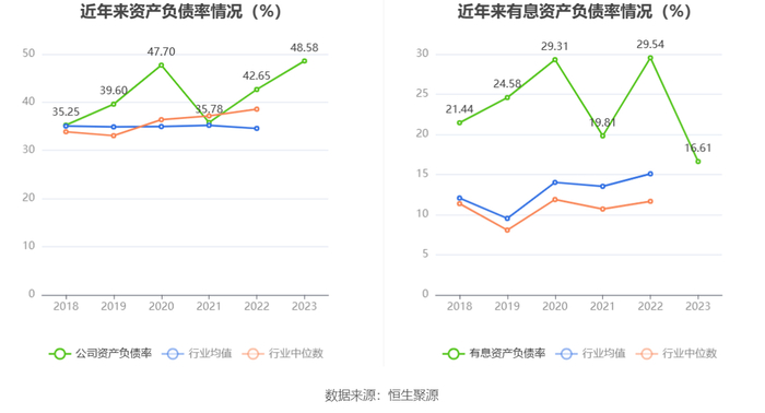 在偿债能力方面,公司2023年年末资产负债率为48.58%,相比上年末上升5.93个百分点;有息资产负债率为16.61%,相比上年末下降12.93个百分点。