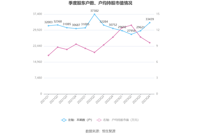 筹码集中度方面,截至2023年年末,公司股东总户数为3.34万户,较三季度末增长了3818户,增幅12.89%;户均持股市值由三季度末的10.71万元下降至9.64万元,降幅为9.99%。
