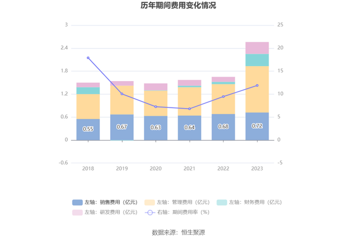 2023年,公司期间费用为2.55亿元,较上年同期增加9028.72万元;期间费用率为11.89%,较上年同期上升2.42个百分点。其中,销售费用同比增长5.2%,管理费用同比增长54.45%,研发费用同比增长148.11%,财务费用同比增长416.51%。