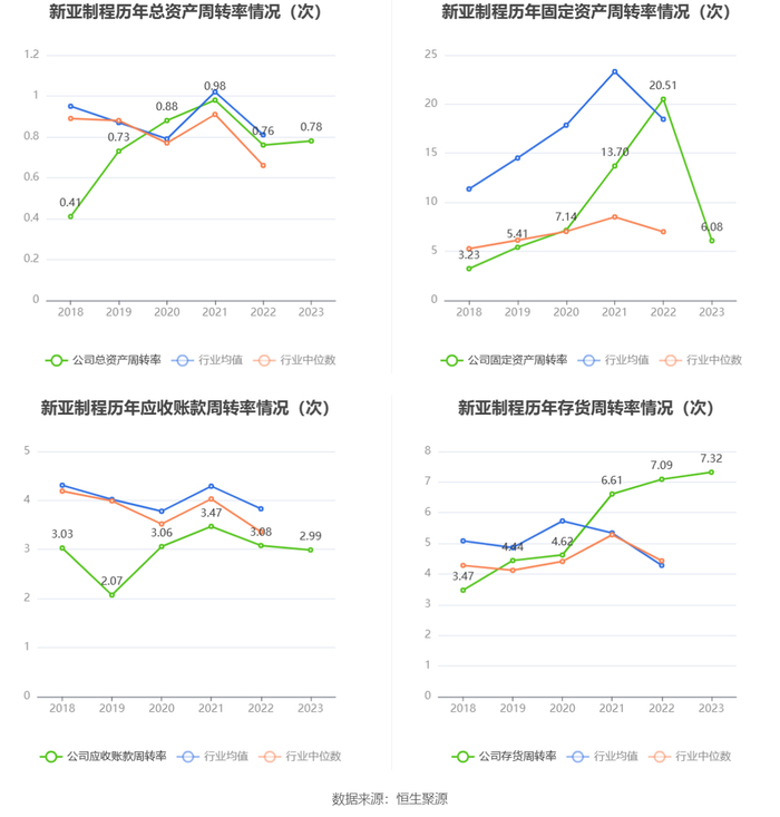 营运能力方面,2023年,公司公司总资产周转率为0.78次,上年同期为0.76次(2022年行业平均值为0.81次,公司位居同行业17/38);固定资产周转率为6.08次,上年同期为20.51次(2022年行业平均值为18.46次,公司位居同行业13/38);公司应收账款周转率、存货周转率分别为2.99次、7.32次。