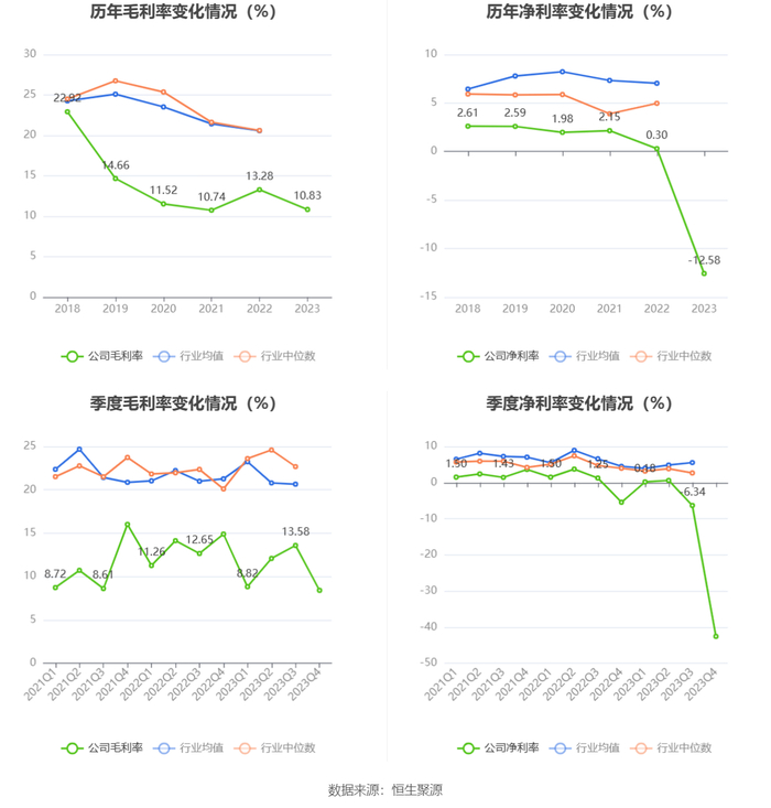 2023年,公司毛利率为10.83%,同比下降2.45个百分点;净利率为-12.58%,较上年同期下降12.88个百分点。从单季度指标来看,2023年第四季度公司毛利率为8.40%,同比下降6.49个百分点,环比下降5.18个百分点;净利率为-42.57%,较上年同期下降37.12个百分点,较上一季度下降36.23个百分点。