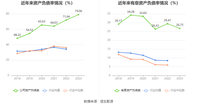 在偿债能力方面,公司2023年年末资产负债率为79.06%,相比上年末上升7.12个百分点;有息资产负债率为26.75%,相比上年末下降2.66个百分点。