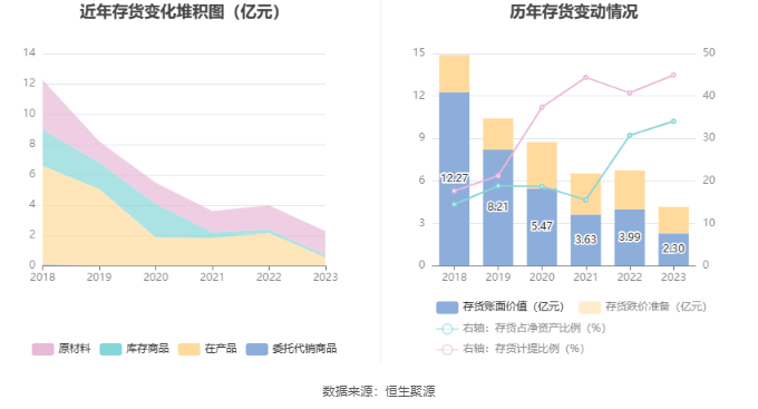从存货变动来看,截至2023年年末,公司存货账面价值为2.3亿元,占净资产的34.04%,较上年末减少1.69亿元。其中,存货跌价准备为1.87亿元,计提比例为44.92%。
