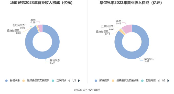 分产品来看,2023年公司主营业务中,影视娱乐收入6.27亿元,同比增长80.51%,占营业收入的94.13%;品牌授权及实景娱乐收入0.09亿元,同比下降20.83%,占营业收入的1.35%;互联网娱乐收入0.01亿元,同比下降54.34%,占营业收入的0.15%。