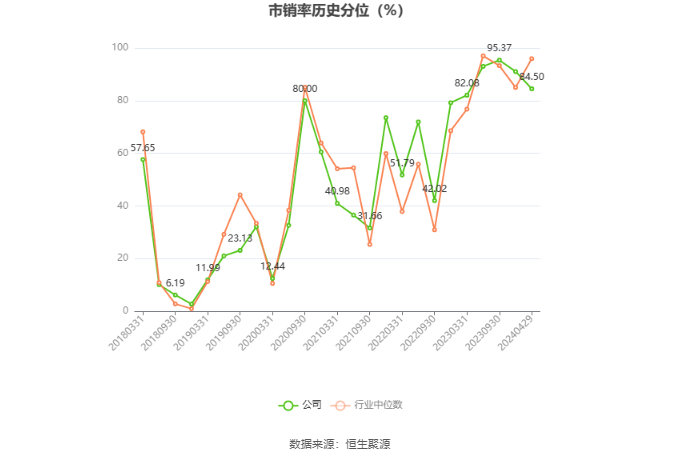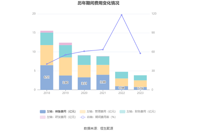 2023年,公司期间费用为3.84亿元,同比减少9224.52万元;期间费用率为57.67%,同比下降60.76个百分点。其中,销售费用同比下降22.97%,管理费用同比下降13.32%,财务费用同比下降24.3%。