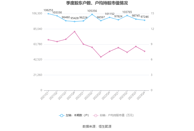 筹码集中度方面,截至2023年年末,公司股东总户数为9.72万户,较三季度末下降了1499户,降幅1.52%;户均持股市值由三季度末的8.60万元下降至7.65万元,降幅为11.05%。