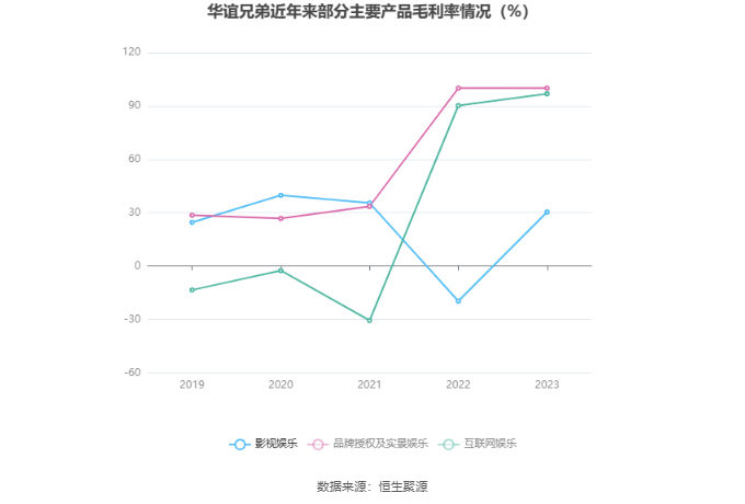 分产品看,影视娱乐、品牌授权及实景娱乐、互联网娱乐2023年毛利率分别为30.35%、100.00%、96.84%。