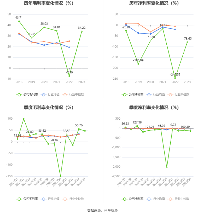 2023年,公司毛利率为34.22%,同比上升41.52个百分点;净利率为-78.65%,较上年同期上升167.87个百分点。从单季度指标来看,2023年第四季度公司毛利率为47.44%,同比上升195.90个百分点,环比下降8.32个百分点;净利率为-132.17%,较上年同期上升1892.06个百分点,较上一季度下降31.88个百分点。