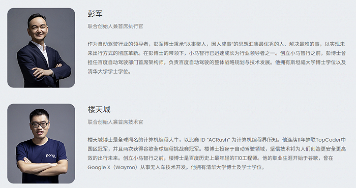 其中,彭军曾任百度自动驾驶首席架构师(负责百度自动驾驶的整体战略规划与技术发展)。在谷歌工作期间,彭军还拿到过谷歌最高奖——谷歌创始人奖。