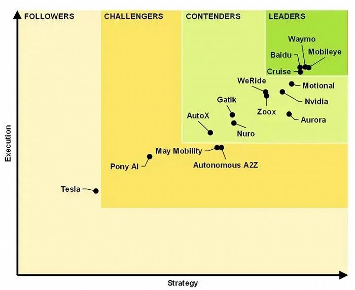 国际知名调研机构Guidehouse Insights,每年会对全球自动驾驶技术公司进行竞争力分析。在该机构2023年的榜单中,评估了 16 家为轻型到中型车辆开发 L4 级自动驾驶系统的公司,并将其分为四个层级:领导者、竞争者、挑战者和跟随者。报告根据 10 项标准,如公司的愿景、市场战略、合作伙伴关系、技术成熟度、产品能力等,对每家公司的执行能力和策略能力进行了评分。