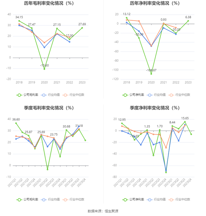 2023年,公司毛利率为27.69%,同比上升10.69个百分点;净利率为6.38%,较上年同期上升26.58个百分点。从单季度指标来看,2023年第四季度公司毛利率为21.72%,同比上升14.09个百分点,环比下降9.46个百分点;净利率为-5.99%,较上年同期上升66.02个百分点,较上一季度下降21.64个百分点。