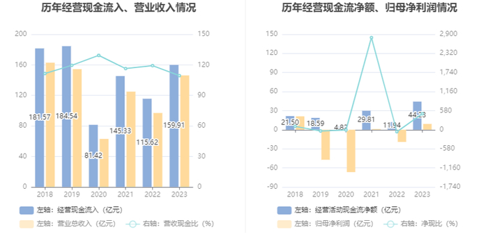 2023年,公司经营活动现金流净额为44.23亿元,同比增长270.40%;筹资活动现金流净额-35.60亿元,同比减少18.71亿元;投资活动现金流净额-5.57亿元,上年同期为-7.33亿元。