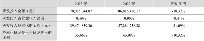 2023年全年,公司研发投入金额为7091.50万元,同比下降18.32%;研发投入占营业收入比例为0.49%,相比上年同期下降0.41个百分点。此外,公司全年研发投入资本化率为55.66%。