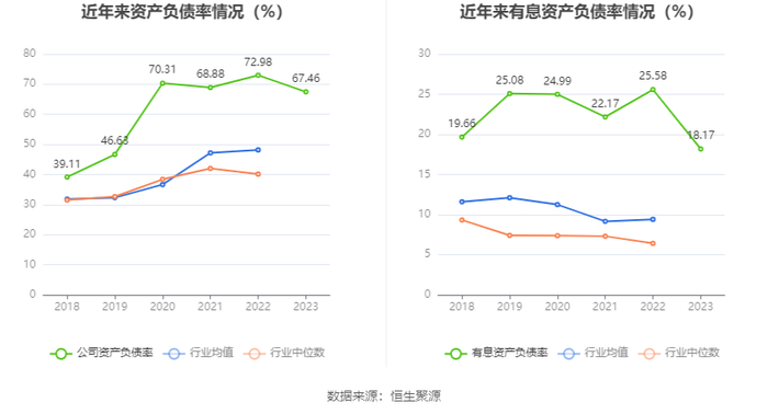 在偿债能力方面,公司2023年年末资产负债率为67.46%,相比上年末下降5.52个百分点;有息资产负债率为18.17%,相比上年末下降7.41个百分点。