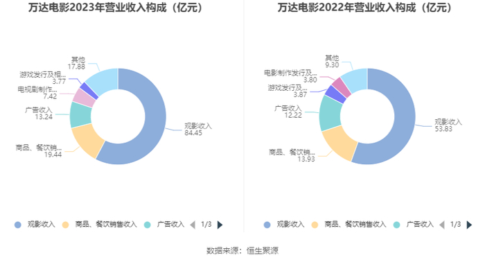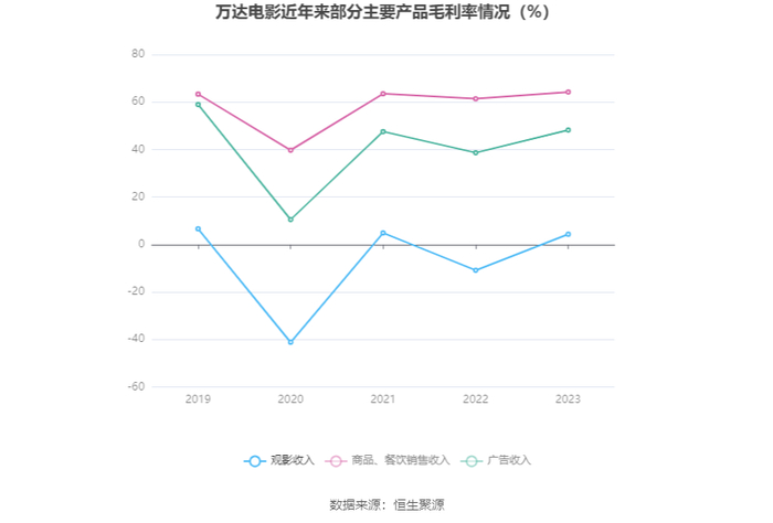 分产品看,观影收入、商品、餐饮销售收入、广告收入2023年毛利率分别为4.32%、64.22%、48.22%。