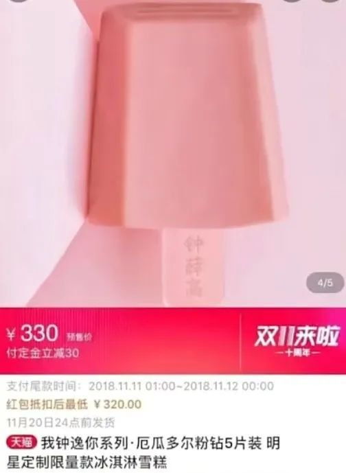 2018年双十一,钟薛高推出“厄瓜多尔粉钻”雪糕,并称其为“科学家耗时13年提纯的天然粉色巧克力”搭配“价值120万一吨的日本柚子”制成,因为原料过于稀缺,仅仅发售2万支。
