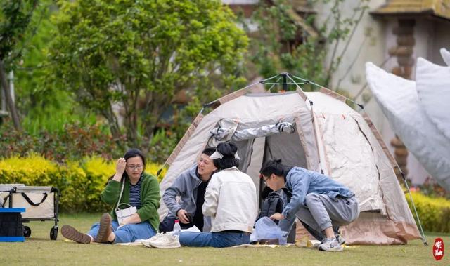 中午时分,园内的露营区里,不少游客在草坪上、花丛旁搭起了帐篷。孩子们在阳光中快乐地奔跑、嬉戏,尽情享受春日好时光。