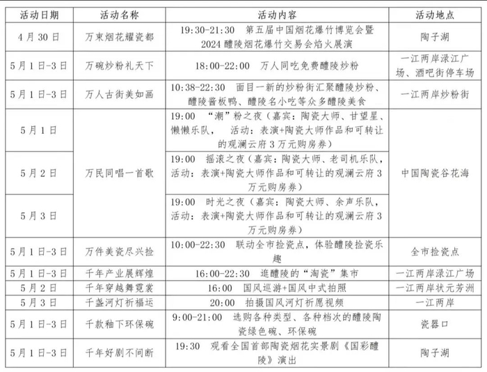 免费吃炒粉、免费听音乐、免费捡瓷器......五一假期来临,2024年株洲夏季旅游节暨第二届醴陵炒粉节活动又将热力启动。活动以“千年瓷都烟花秀 五彩醴陵炒粉节”为主题,于5月1日至3日,在醴陵市一江两岸等地举行。