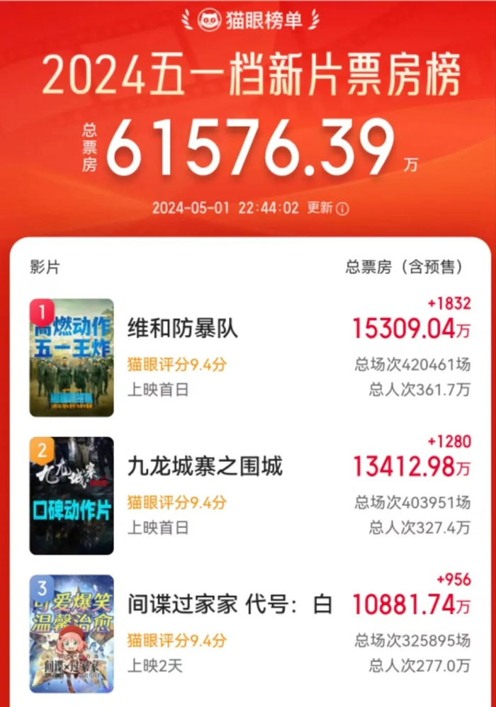 截至5月1日22时44分,2024年“五一档”新片总票房(含点映及预售)已超过6亿元,《维和防暴队》《九龙城寨之围城》《间谍过家家 代号:白》分列前三位。