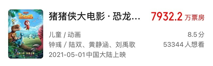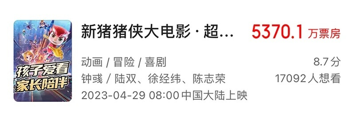 家庭观影需求呈现上升势头。比如春节档“熊出没”系列电影票房屡创新高就是最好的例子。相较于《间谍过家家》这种粉丝向作品,《猪猪侠》则是亲子动画赛道的老品牌,2021和2023年的两部电影版也都是选在“五一”档期,分别获得了7932.2万元和5370.1万元的票房成绩。