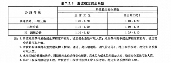 交通部最新一版的《公路路基设计规范》对滑坡路段路基作出滑坡稳定安全系数要求,高速公路正常工况系数为1.2至1.3,非正常工况I情况下为1.1至1.2。这意味着,在非正常工况下,边坡的安全性会降低。